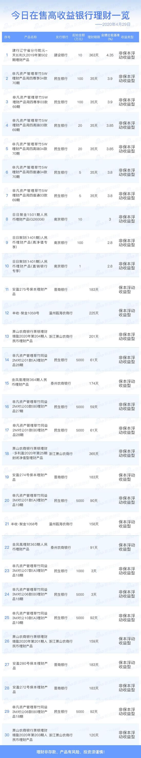 4月29日在售高收益银行理财产品一览