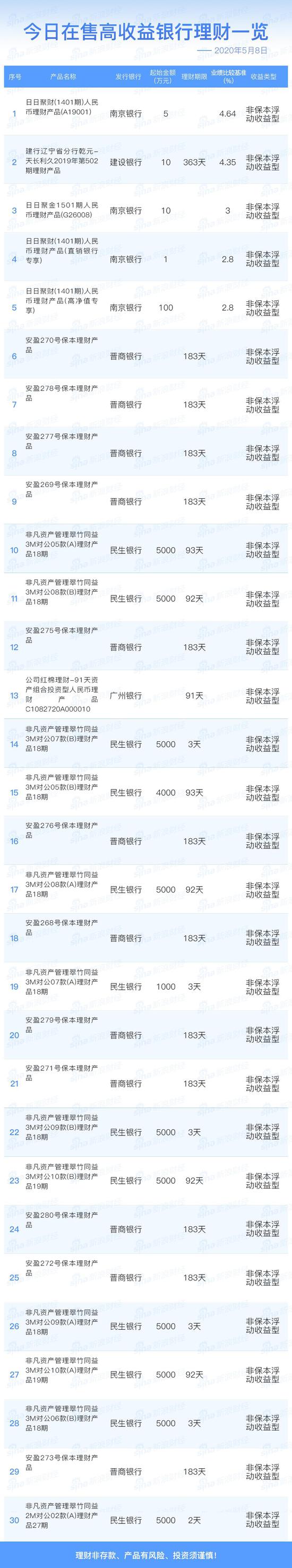 5月8日在售高收益银行理财产品:今日业绩比较基准在4.5%以上的银行人民币理财产品有一款,是南京银行(7.760, 0.07, 0.91%)的“日日聚财(1401期)人民币理财产品(A19001)”,业绩比较基准为4.64%。