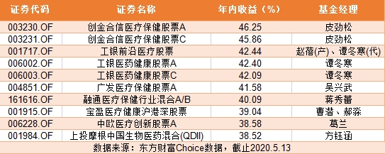 近年来医药板块一直处于优质赛道,今年在抗击疫情的催化之下,表现格外强势。数据显示,截至5月13日,中信一级行业中,医药行业今年以来凭借18.05%的涨幅位列第一。受此影响,医药主题基金表现耀眼,在全部股票基金前十(A、C份额合并统计)中占据逾半壁江山,包括了创金合信医疗保健、工银养老产业、工银前沿医疗、工银医药健康、宝盈医疗健康沪港深、广发医疗保健。其中,创金合信医疗保健、工银前沿医疗股票等多只基金年内涨幅超40%。