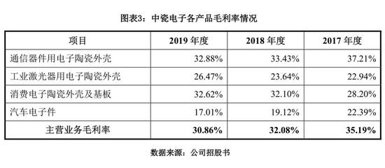 招股书显示,2017—2019年,中瓷电子综合毛利率分别为34.55%、31.27%、30.02%,呈持续下跌态势。其中,收入占比较大的通信器件用电子陶瓷外壳、汽车电子件等产品,毛利率均有不同程度的下滑。
