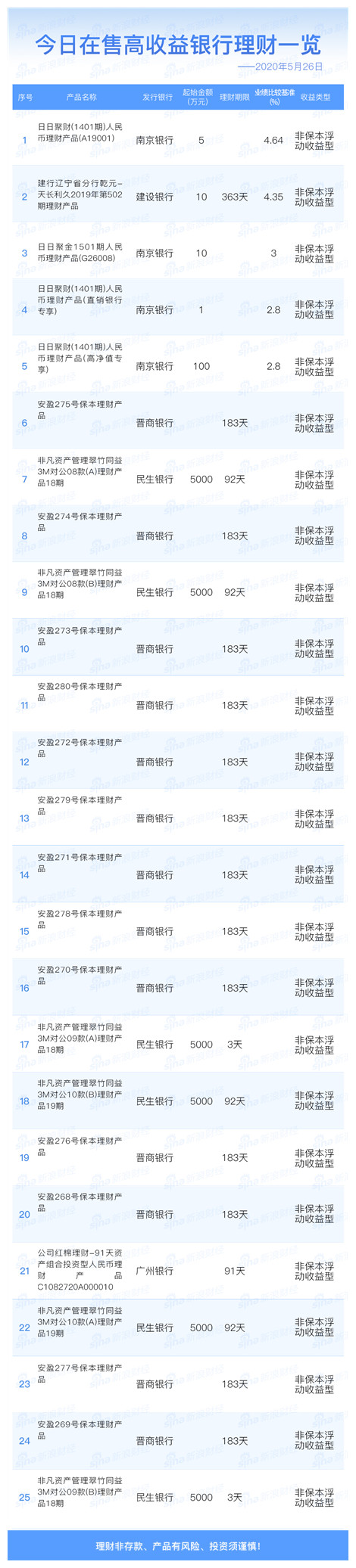 5月26日在售高收益银行理财产品:今日业绩比较基准在4.6%以上的银行人民币理财产品共1款。南京银行(7.650, 0.03, 0.39%)的“日日聚财(1401期)人民币理财产品(A19001)”业绩比较基准最高,为4.64%。