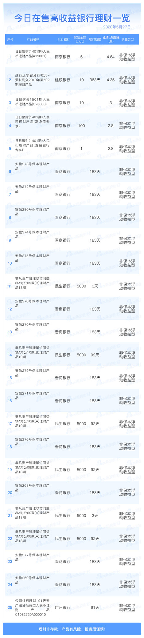 5月27日在售高收益银行理财产品:今日业绩比较基准在4.6%以上的银行人民币理财产品共1款。南京银行(7.780, 0.12, 1.57%)的“日日聚财(1401期)人民币理财产品(A19001)”业绩比较基准最高,为4.64%。