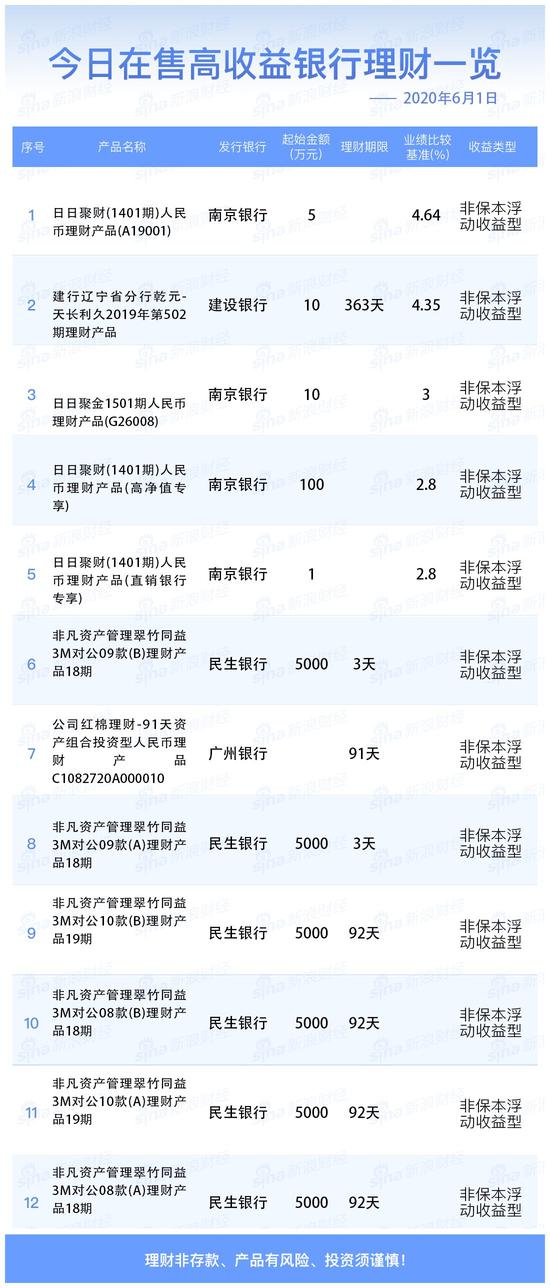 6月1日在售高收益银行理财产品一览