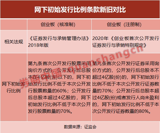 在过去核准制下创业板IPO网下配售中,上述比例依次为20%、40%、10%。