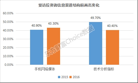 2016年受访投资者的投资信息渠道结构相比2015年发生了较大变化。随着移动互联技术的蓬勃发展,使用手机网络类媒体渠道的投资者比例较2015年上升2.4个百分点,达到43.3%;依据技术指标分析的投资者比例较上年下降9.3个百分点,约40.4%。手机网络类媒体首次超越技术指标分析,变为投资者首选的投资信息渠道。