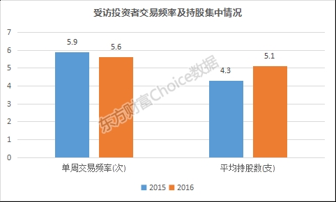 受访投资者的交易频率均值为5.6次/月,51.4%的受访者至少每周交易一次,交易频率普遍较高;相比2015年的平均交易频率5.9次/月,交易频率有所下降,投资者交易行为趋向稳健。