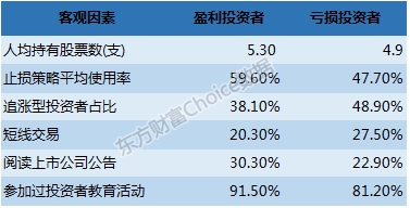 客观原因主要来自于投资行为偏差,表现为止损策略平均使用率较低、追涨行为和短线交易人数比例较高、阅读上市公司公告及参加投资者教育活动的投资者比例较低。而盈利投资者在这些方面都做得相对好些。