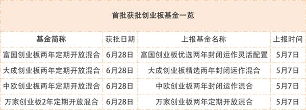 6月28日,首批4只创业板基金获批了——富国、大成、中欧、万家基金旗下的4只基金率先拿到批文。