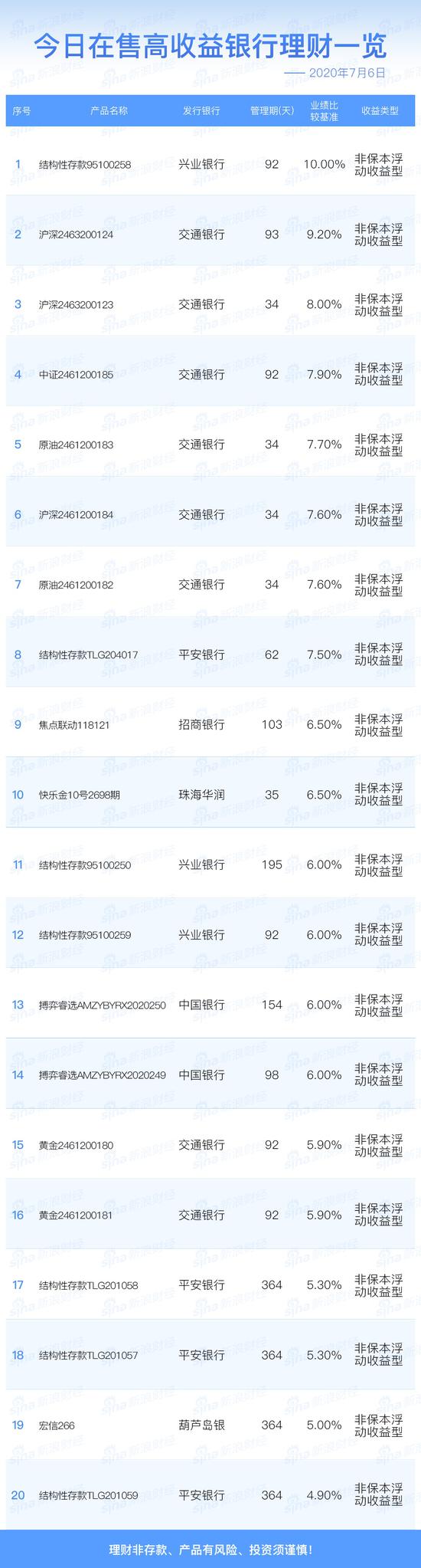 7月6日在售高收益银行理财产品一览