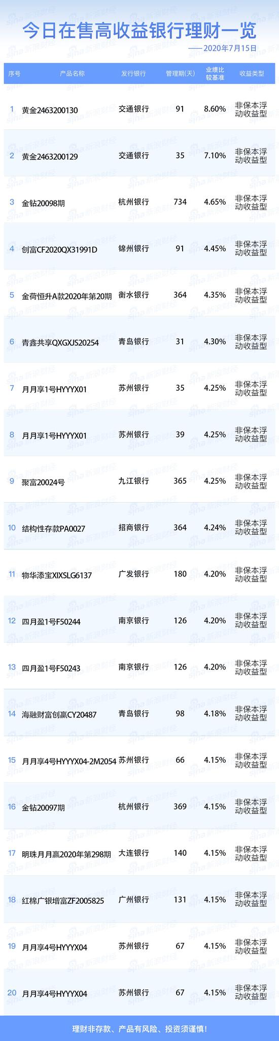 7月15日在售高收益银行理财产品一览