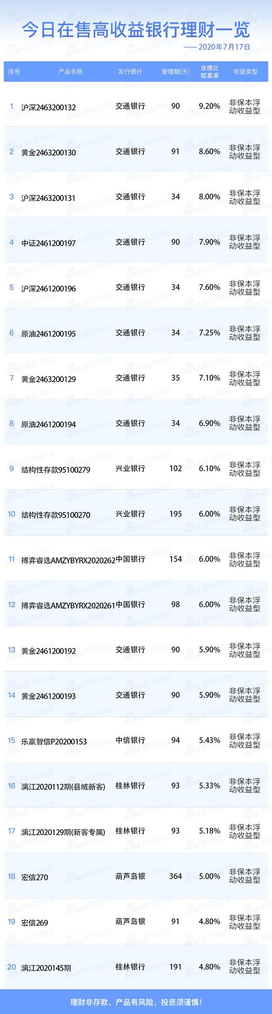 7月17日在售高收益银行理财产品:今日业绩比较基准在8.0%及以上的银行人民币理财产品共3款。交通银行(4.960, 0.07, 1.43%)的“沪深2463200132”业绩比较基准最高,为9.20%。