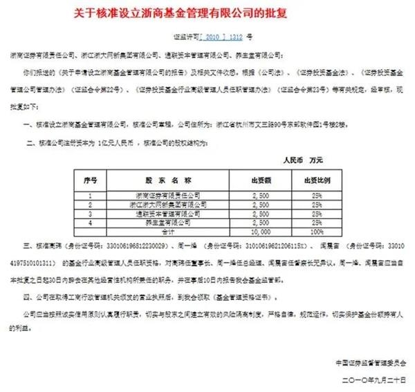 证监会官网信息显示,浙商基金成立于2010年9月,注册资本1亿元,浙商证券有限公司(2017年在上交所上市,证券代码601878)、通联资本管理公司(下称“通联资本”)、养生堂有限公司(下称“养生堂”)、浙江浙大网新集团(下称“浙大网新”)分别持股25%。