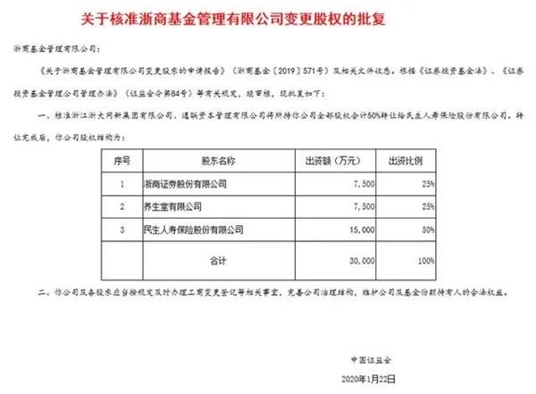 2015年4月,保监会发文,核准了民生人寿的申请,主要内容之一是:“原则同意你公司运用2.04亿元自有资金,以收购股权方式投资浙商基金管理有限公司(简称浙商基金)50%股权,并对其实施控制。”
