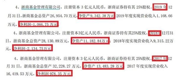 在资产负债表方面,浙商证券披露的定期报告显示,2017年至2019年,浙商基金的资产负债率依次为58.16%、60.23%及65.34%,逐年增长,净资产则依次为13483.28万元、11182.84万元及9342.38万元,逐年减少。