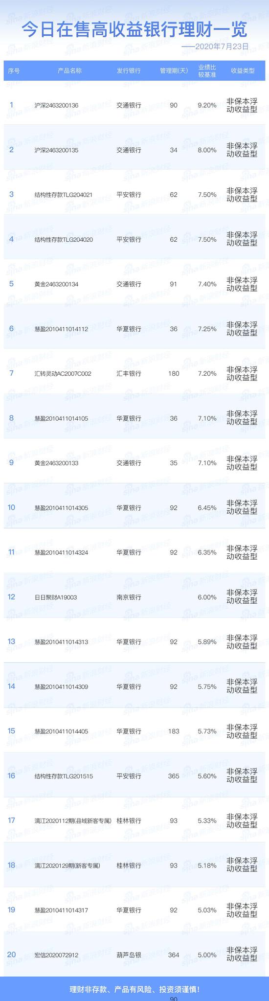 7月23日在售高收益银行理财产品一览