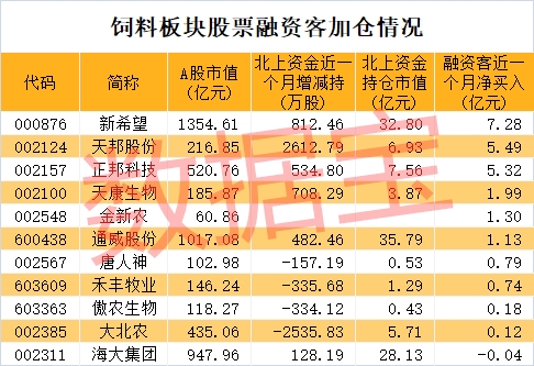 北上资金和融资客的目光也早已关注到饲料板块。数据显示,近一个月来,北上资金增持天邦股份、新希望、天康生物、正邦科技、通威股份、海大集团等股超过百万股,其中天邦股份获增持最多,达到2613万股,北上资金持仓市值达到6.93亿元。融资客超亿元加仓的也有6只,分别是新希望、天邦股份、正邦科技、天康生物、金新农、通威股份。新希望获融资客净买入额7.28亿元居首,最新融资余额达到52.21亿元。