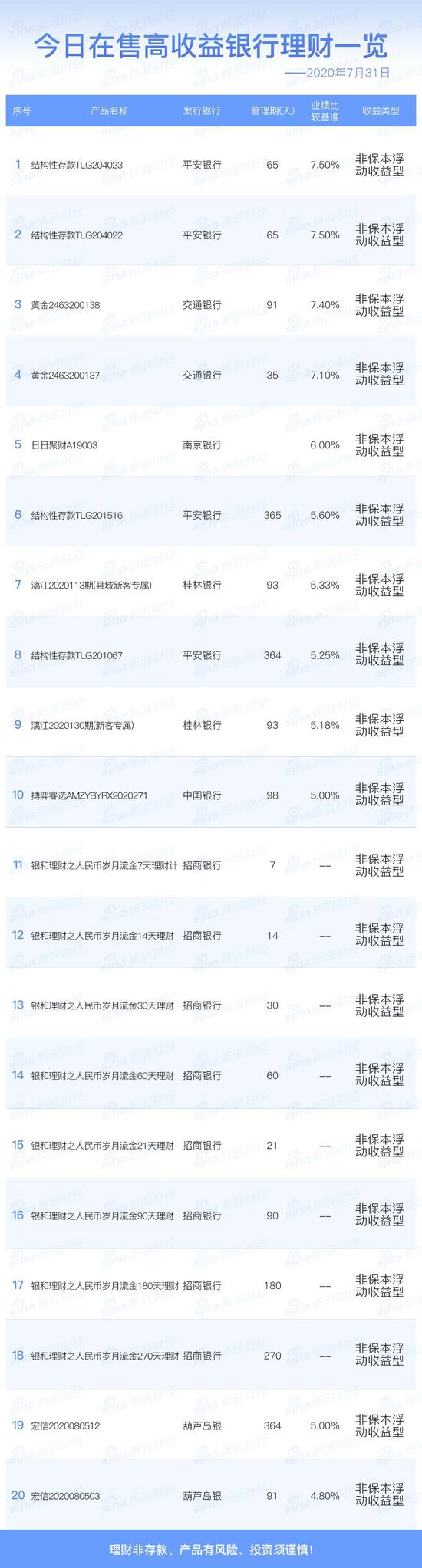 7月31日在售高收益银行理财产品:今日业绩比较基准在7.00%及以上的银行人民币理财产品共4款。平安银行(13.300, -0.07, -0.52%)的“结构性存款TLG204023”和“结构性存款TLG204022”业绩比较基准最高,同为7.50%。
