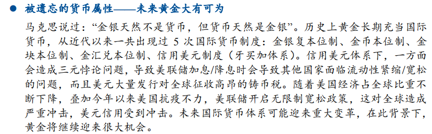 东吴证券表示,全球货币政策宽松,低利率乃至负利率资产规模创新高,地缘局势不稳定。稀缺性以及零利率特性使贵金属资产做多热情达到又一高点,金银贵金属的避险价值凸显。民生证券分析,随着美国经济占全球比重不断下降,叠加今年以来美国抗疫不力,美联储开启无限制宽松政策,这对全球造成严重冲击,美元信用受到冲击。未来国际货币体系可能迎来重大变革,在此背景下,黄金将继续迎来很大机会。