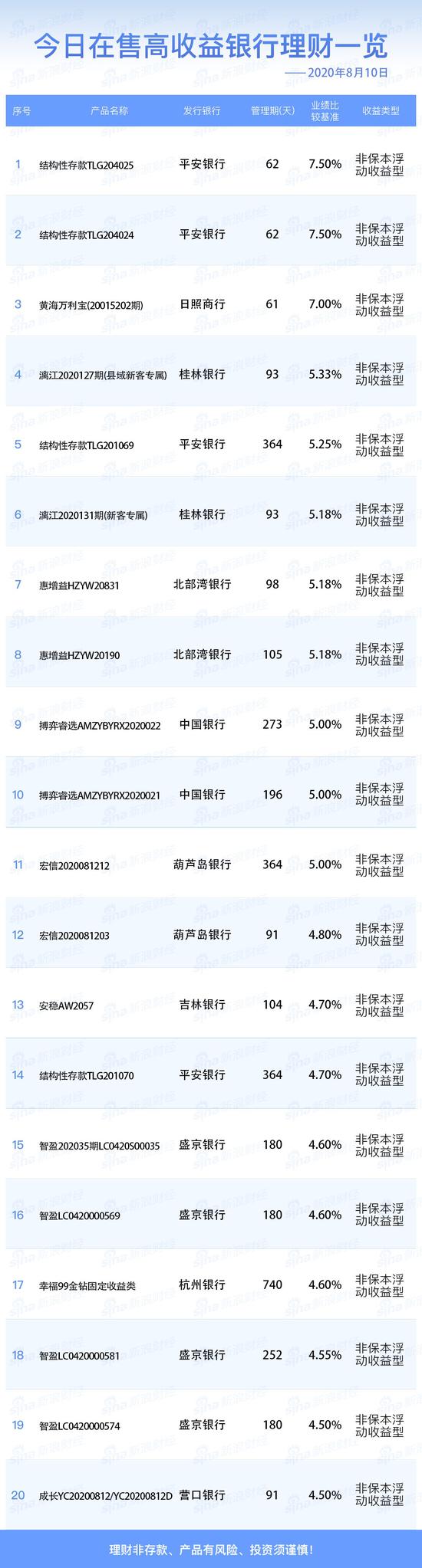 8月10日在售高收益银行理财产品一览