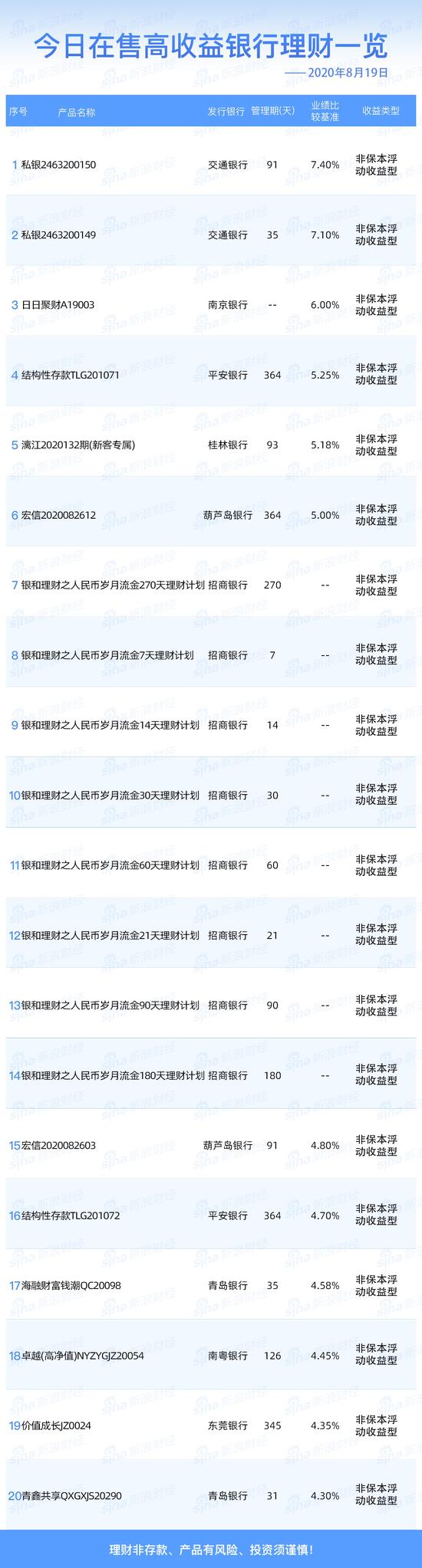 8月19日在售高收益银行理财产品:今日业绩比较基准在7.00%及以上的银行人民币理财产品共2款。交通银行的“私银2463200150”业绩比较基准最高,为7.40%。