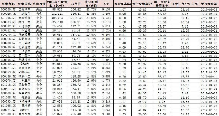 1)2015年未分配利润占总市值比不低于10%。只有未分配利润充足才有高分红预期。