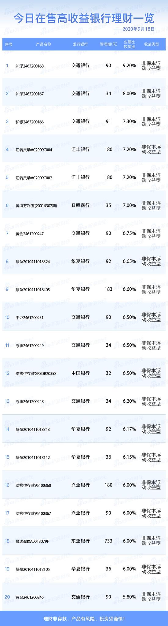 9月18日在售高收益银行理财产品:今日业绩比较基准在8.00%及以上的银行人民币理财产品共2款。交通银行(4.640, 0.00, 0.00%)的“沪深2463200168”业绩比较基准最高,为9.20%。