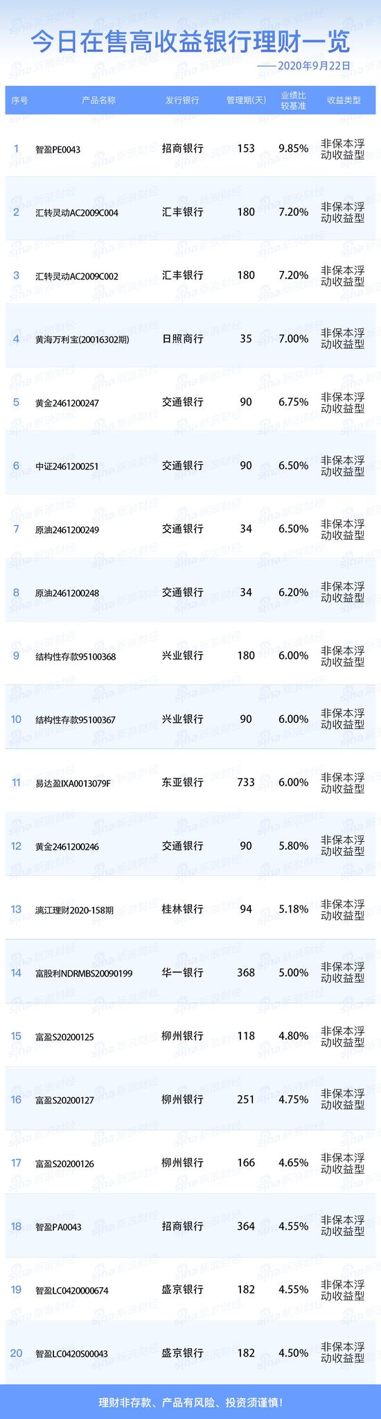 9月22日在售高收益银行理财产品:今日业绩比较基准在7.00%及以上的银行人民币理财产品共4款。招商银行(38.090, -0.51, -1.32%)的“银和理财之人民币岁月流金180天理财”业绩比较基准最高,为9.85%。