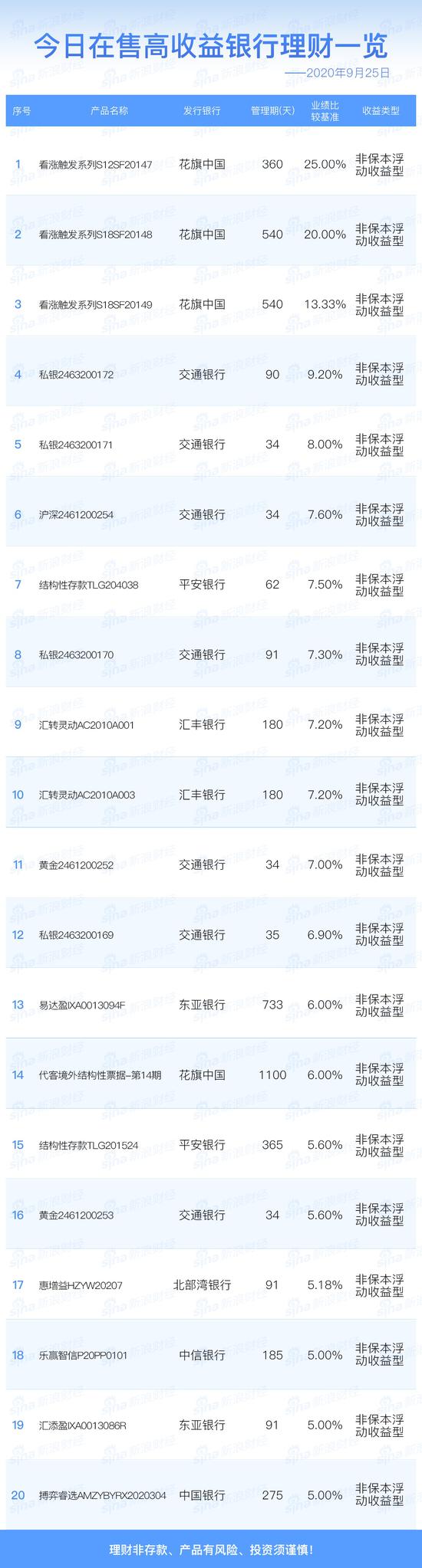 9月25日在售高收益银行理财产品:今日业绩比较基准在9.00%及以上的银行人民币理财产品共4款。花旗中国的“看涨触发系列S12SF20147”业绩比较基准最高,为25%。