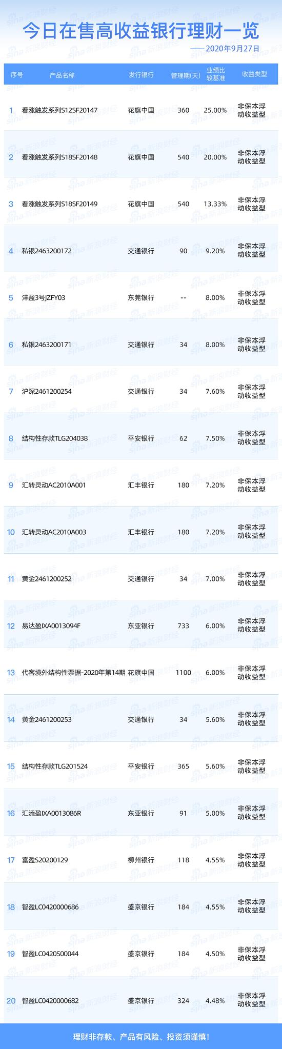 9月27日在售高收益银行理财产品一览