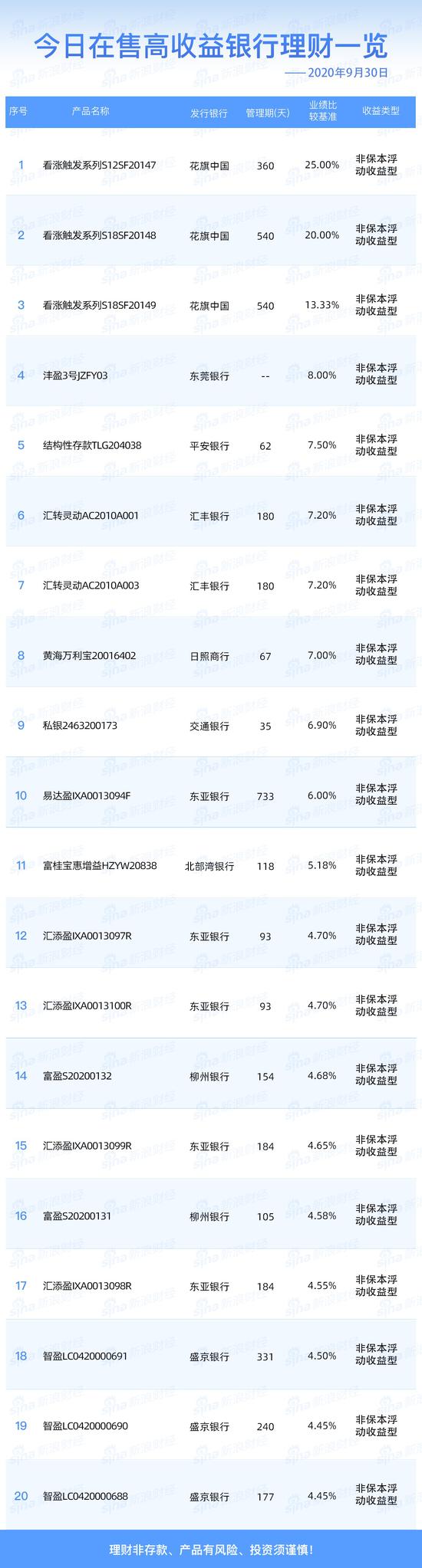 9月30日在售高收益银行理财产品:今日业绩比较基准在7.00%及以上的银行人民币理财产品共8款。花旗中国的“看涨触发系列S12SF20147”业绩比较基准最高,为25%。
