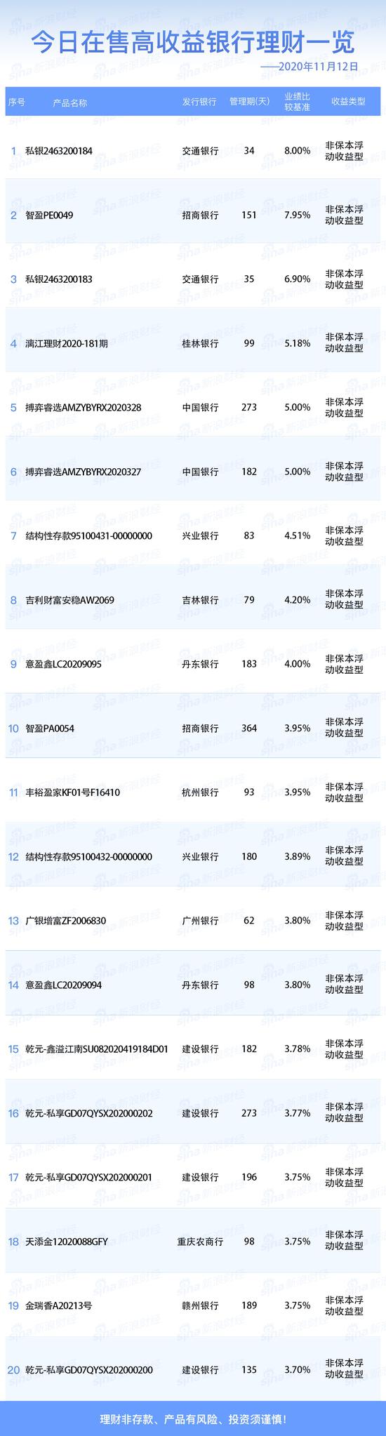 11月12日在售高收益银行理财产品:今日业绩比较基准在5%以上的银行人民币理财产品共6款。交通银行(4.630, -0.01, -0.22%)的“私银2463200184”业绩比较基准最高,为8.00%。