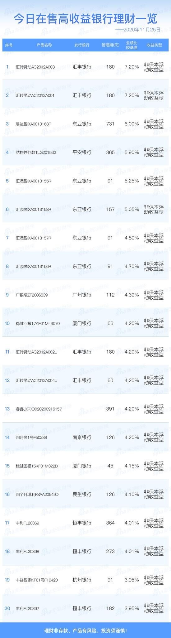 11月25日在售高收益银行理财产品:今日业绩比较基准在6%及以上的银行人民币理财产品共3款。汇丰银行的“汇转灵动AC2012A003”业绩比较基准最高,为7.20%。