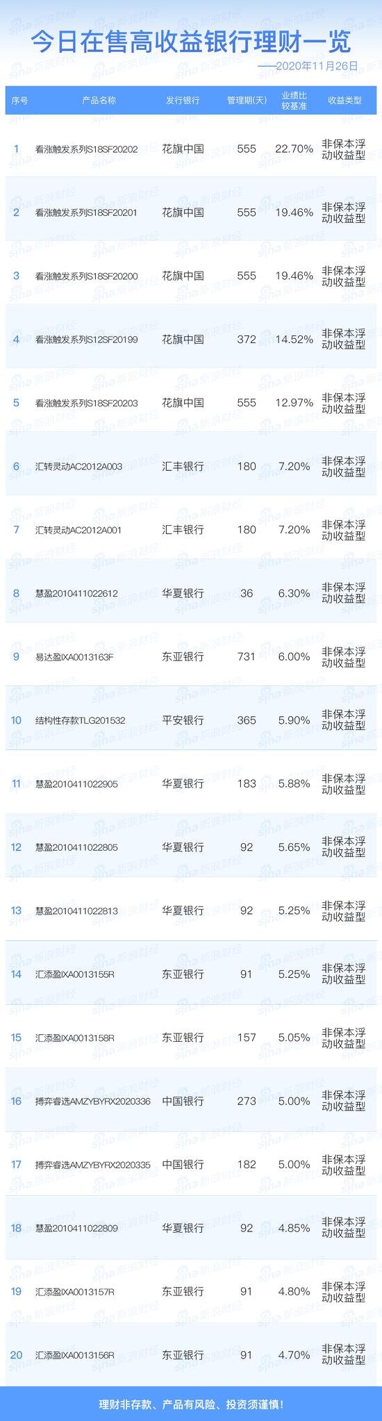 11月26日在售高收益银行理财产品:今日业绩比较基准在6%及以上的银行人民币理财产品共9款。花旗中国“看涨触发系列S18SF20202”业绩比较基准最高,为22.70%。