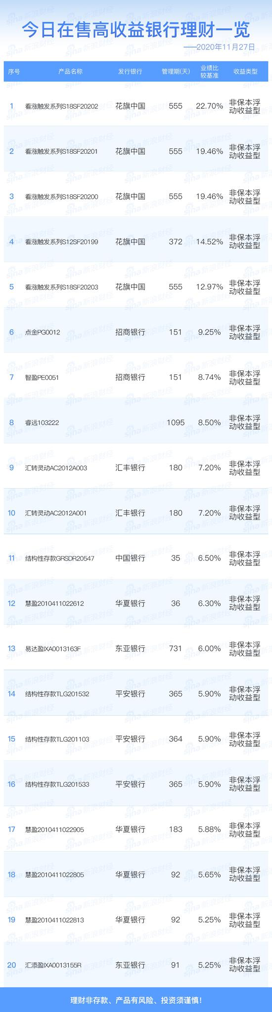 11月27日在售高收益银行理财产品:今日业绩比较基准在9%以上的银行人民币理财产品共6款。花旗中国“看涨触发系列S18SF20202”业绩比较基准最高,为22.70%。