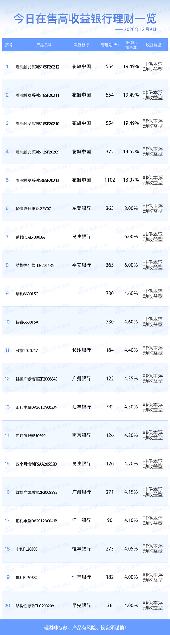 12月9日在售高收益银行理财产品:今日业绩比较基准在8%以上的银行人民币理财产品共6款。花旗中国“看涨触发系列S18SF20212”业绩比较基准最高,为19.49%。