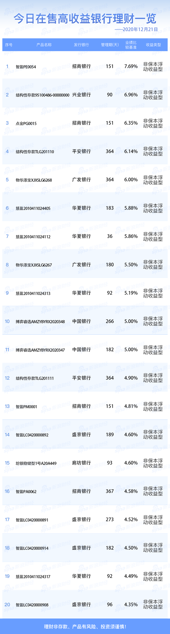 12月21日在售高收益银行理财产品