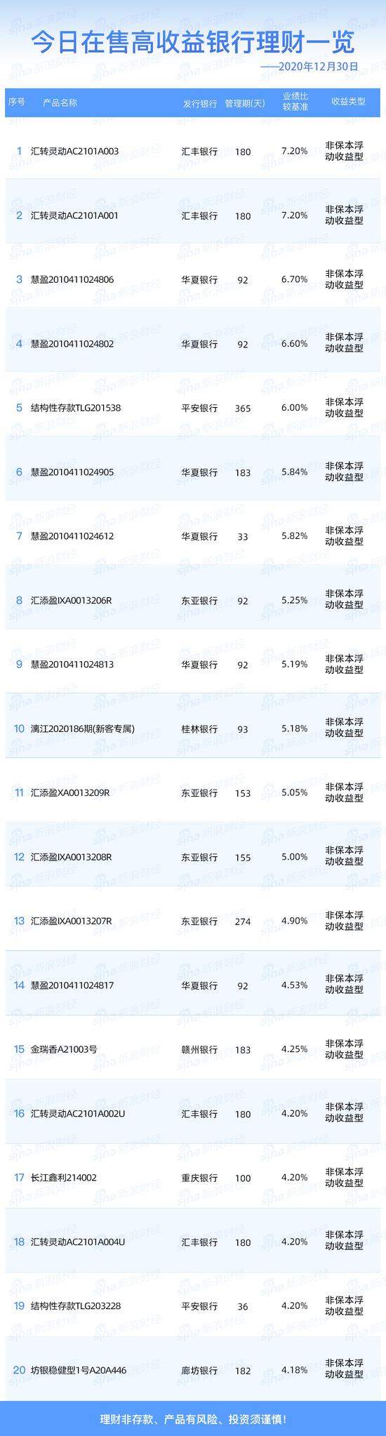 12月30日在售高收益银行理财产品