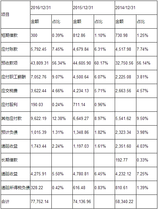 3、历年的预收账款金额都比较大,且在负债中的占比都超过50%,这个是个好现象,说明其产品还是蛮紧俏的。只是2016年预收账款并没有随着营收的增长而增长,预收账款占营收的比例在下滑,说明这个行业的竞争也越来越激烈。