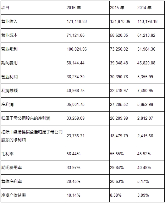 1、总体的资产负债率很低,2014年—2016年分别为28.47%、18.96%、18.38%,最近两年的资产负债率低于20%。