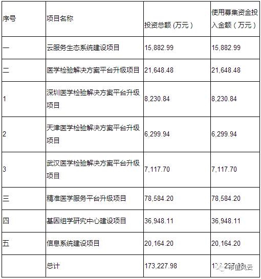 本项目由三个子项目构成,分别由公司的子公司深圳临检、天津医检、武汉医检建设实施。公司拟通过升级扩建三地医学检验所,完善国内区域性临床应用业务布局,提升现有医学检验业务的生产和交付能力,扩展医学检测产品线,扩大公司业务规模,打造公司医学检验整体解决方案平台,进而全面提高公司的品牌知名度、影响力和市场渗透力。