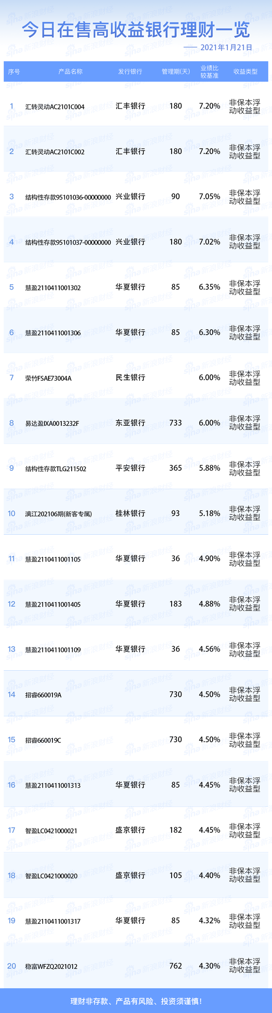 1月21日在售高收益银行理财产品:今日业绩比较基准在7%以上的银行人民币理财产品共4款。汇丰银行“汇转灵动AC2101C004”业绩比较基准最高,为7.20%。
