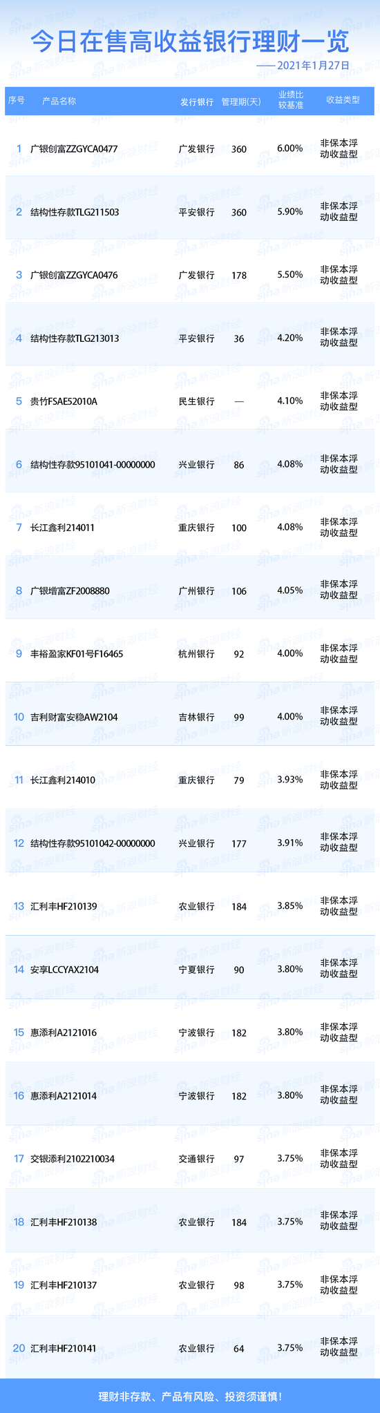 1月28日在售高收益银行理财产品:今日业绩比较基准在5%以上的银行人民币理财产品共3款。广发银行“广银创富ZZGYCA0477”业绩比较基准最高,为5.90%。