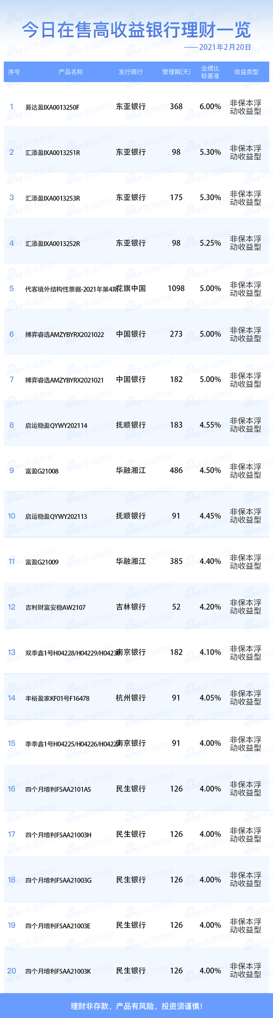 2月20日在售高收益银行理财产品