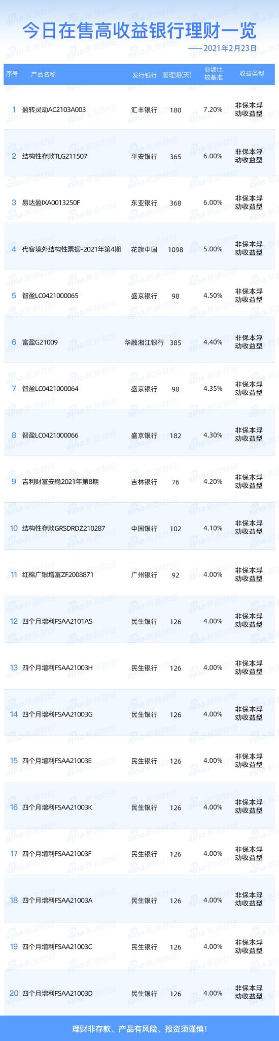 2月23日在售高收益银行理财产品:今日业绩比较基准在5%以上的银行人民币理财产品共4款。汇丰银行“盈转灵动AC2103A003”业绩比较基准最高,为7.20%。