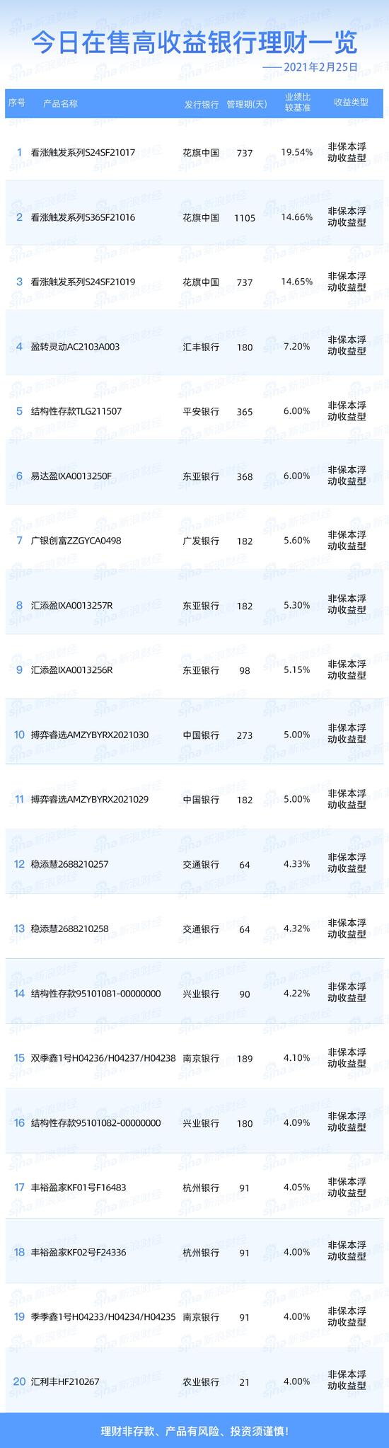 2月25日在售高收益银行理财产品:今日业绩比较基准在6%以上的银行人民币理财产品共6款。花旗中国“看涨触发系列S24SF21017”业绩比较基准最高,为19.54%。