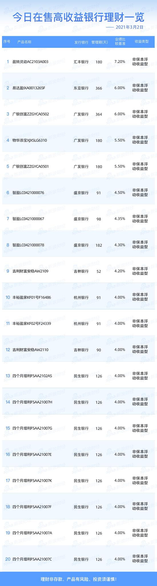 3月2日在售高收益银行理财产品:今日业绩比较基准在5%以上的银行人民币理财产品共5款。汇丰银行“盈转灵动AC2103A003”业绩比较基准最高,为7.2%。
