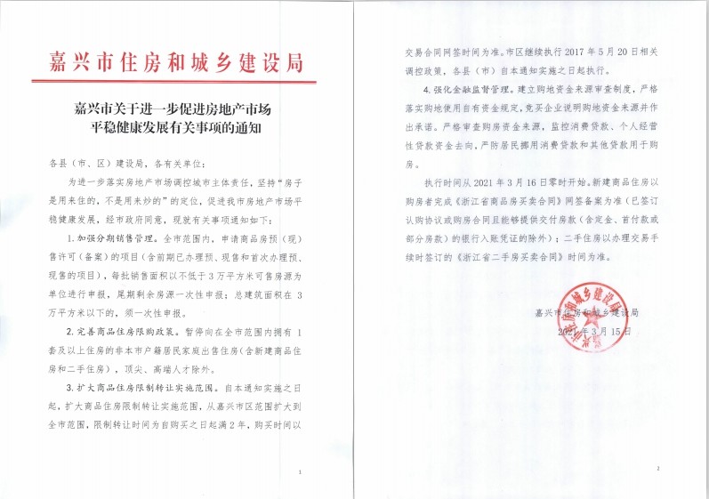 中国网财经3月16日讯据“嘉兴城乡建设”微信号16日消息,嘉兴市住建局15日发布《关于进一步促进房地产市场平稳健康发展有关事项的通知》(以下简称《通知》),从加强分期销售管理、完善商品住房限购政策、扩大商品住房限制转让实施范围、强化金融监督管理等方面进一步加强调控。执行时间从3月16日零时开始。