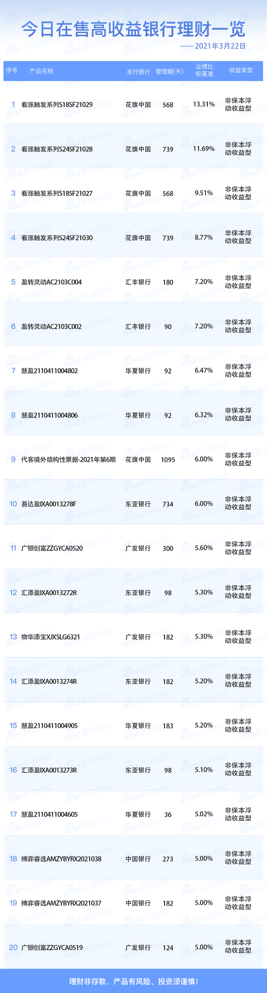 3月22日在售高收益银行理财产品