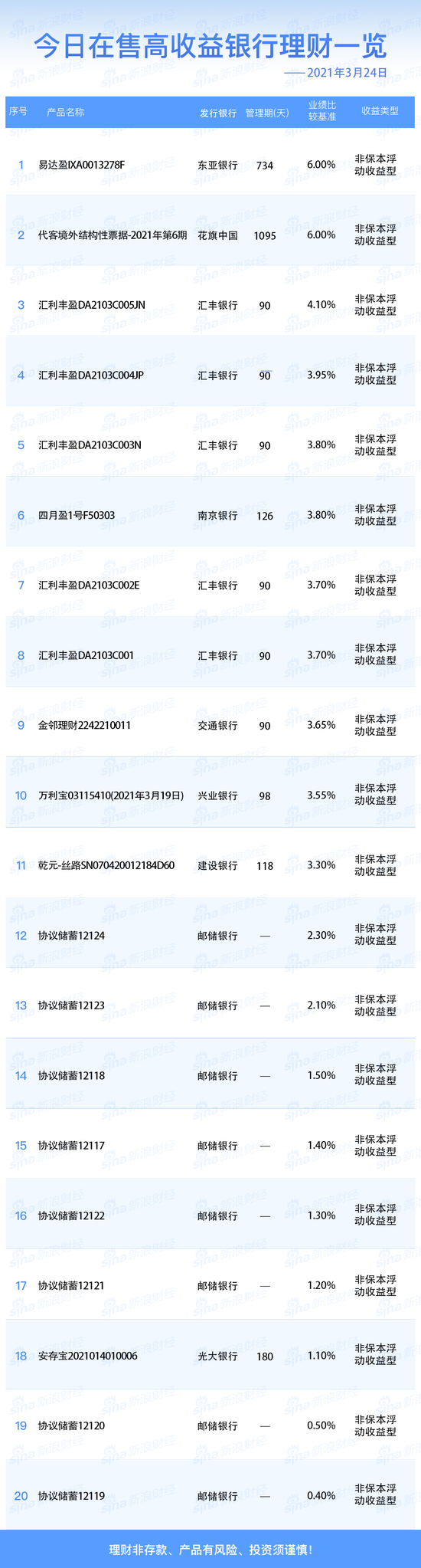 3月24日在售高收益银行理财产品:今日业绩比较基准在4%以上的银行人民币理财产品共3款。东亚银行“易达盈IXA0013278F”业绩比较基准最高,为6.00%。