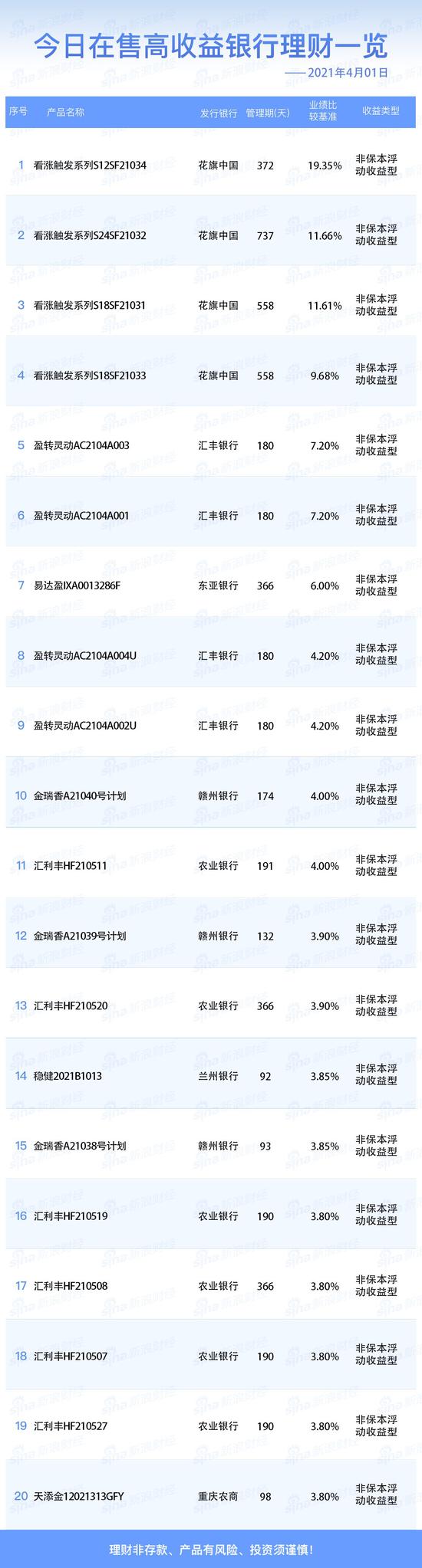 4月1日在售高收益银行理财产品:今日业绩比较基准在7%以上的银行人民币理财产品共6款。花旗中国“看涨触发系列S12SF21034”业绩比较基准最高,为19.35%。